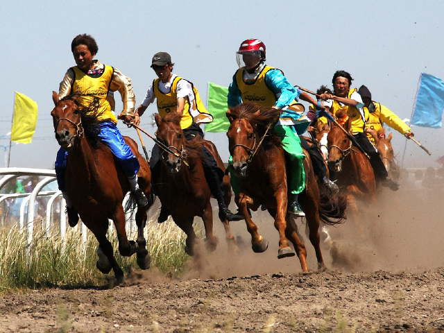 那达慕大会是一年一度蒙古族较大体育盛会,在当地人的心中是神圣的存在。盛夏时节,百灵庙镇外草滩搭起众多蒙古敖包,方圆数百里牧民、骑马乘车盛装赴会。那达慕,在蒙语中是“娱乐”或“游戏”的意思,每次大会颇为引人瞩目的莫过传统的三技:赛马,射箭,以及摔跤。骑马和射箭对于马背上的民族来说肯定是非常重要的,而摔跤更是他们确认强者的主要标志,所以这三项运动运动也是整个大会的亮点。