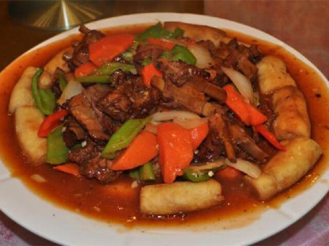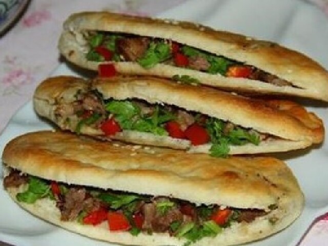 昌吉回族自治州的馕肉饼是一道很有特色的佳肴。馕焖肉顾名思义就是在馕上加肉。通常的肉主要采用羊肉和牛肉。先将羊肉或牛肉煮熟,然后加上馕饼以其焖熟,熟后拿出置于盘子上,切成快加上调料即可食用。香醇的馕饼加上鲜美的肉,佳肴也不过如此了吧。