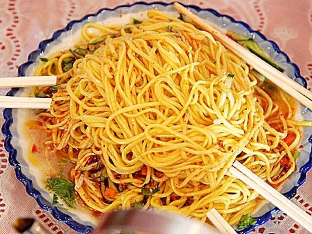 黄面在昌吉可谓是一道不能错过的佳肴,经过回民师傅不得了的手工拉出的面粗细均匀,且有韧劲儿。调上点儿黄油、醋、拌出来的面油亮金黄,口感甚佳。而“烤肉拌凉面”的独特吃法,更是受到外地来客的喜爱。在昌吉当地大大小小的餐馆内均可以吃到这道美味的黄面。