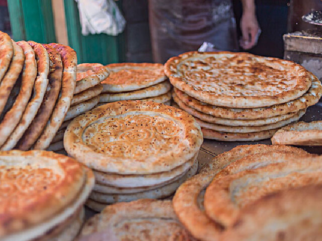 馕是新疆同胞日常主要食品,它是一种烤制而成的面饼,近似烧饼,或脆或软,味香适口。
