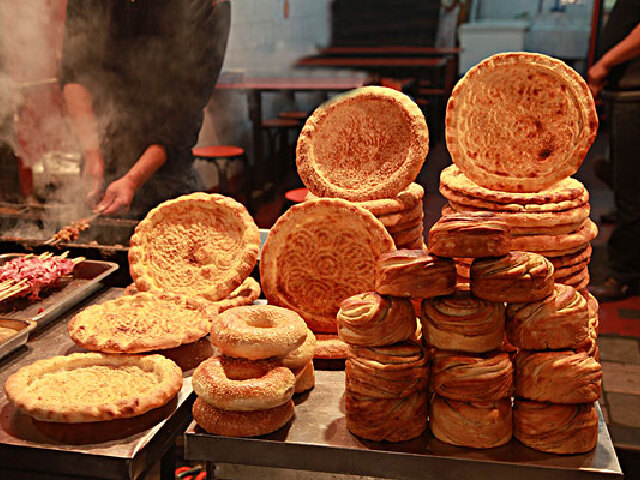 馕是吐鲁番维吾尔族人主要的传统面食品之一.“可以一日无菜,不可一日无馕”,是馕重要性的很好概括.馕的品种很多,大约有50多种,主要有肉馕、油馕、片馕、窝窝囊和芝麻馕.“艾克曼馕”是较大的馕,直径30~40厘米;“托喀西馕”是较小的馕,直径3-5厘米;“窝窝囊”维吾尔语叫“格尔黛馕”,是很厚的馕,厚7-10厘米;“片馕”四周厚,中间薄,较薄处仅0.3厘米.馕的主要原料为面粉,制作时可以根据不同口味配以鸡蛋、清油、洋葱、芝麻、牛油、羊油、盐、冰糖等.维吾尔族馕做工精细、香酥可口,含水份少,外干内酥,久储不坏,便于存放,一般打一坑馕可以吃十天半个月