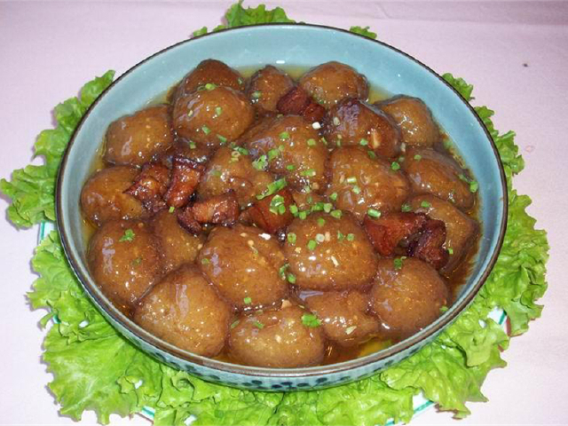 山粉圆也称山粉丸、满堂红。用山粉、芋艿拌入煮鸡肉卤汁,加碎肉、佐料和匀,撮入蒸笼炊熟,食用时再切成片、条或粒。山粉以蕨根粉为正品,葛粉次之,现多用番薯粉。