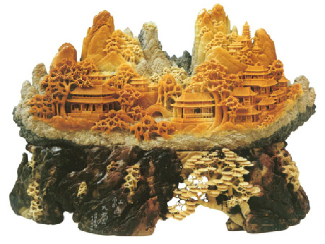 青田石雕是以青田石作为材料雕制而成的艺术品。以秀美的造型、精湛的技艺博得人们喜爱,石作为材料雕制而成的艺术品。以秀美的造型、精湛的技艺博得人们喜爱,被喻为“在石头上绣花”,令人叹为观止。 青田石雕是中国传统石雕艺术宝库中一颗璀璨的明珠,历史悠久。现在可以见到的较早作品是珍藏在浙江博物馆内的出土文物——六朝时期殉葬用的青田石雕小卧猪。作品线条简练、造型古朴、形神兼备,艺术上可见汉、魏风貌。