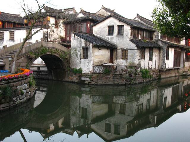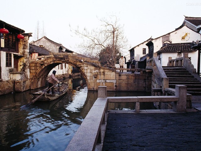 双桥,俗称钥匙桥。在桥上能看总览周庄全貌。双桥分别是世德桥和永安桥,它们一横一竖跨越河流,造型别致有趣,特别能体现古镇的神韵。这座桥出名是因为陈逸飞的画——故乡的回忆。陈逸飞的画使默默无闻的双桥走向了世界。钥匙桥不是钥匙胜过钥匙,因为它开启了周庄与国际交往的友谊之门。