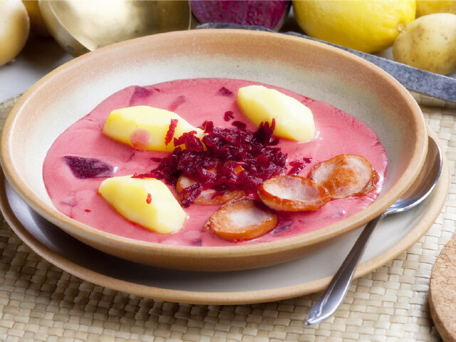 甜菜汤是由红菜、牛肉、搭配酸酸的奶油制作而成,这是白俄罗斯常出现在惭怍上的食物之一。做好的甜菜汤呈现粉红色,味道带有一点酸,十分美味,饭前喝一碗十分开胃。