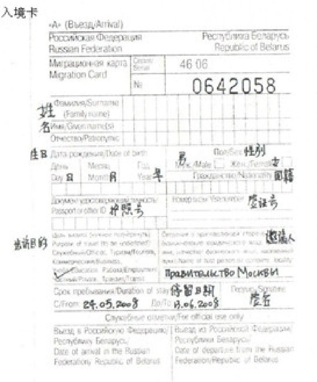 “出入境卡”分别由A表和B表组成,A表为入境卡,B表为出境卡。出入境卡的出入境部分(A表和B表)由入境人员用黑、蓝、紫色钢笔及圆珠笔亲自填写,填写内容相同。B表上需填写:姓名、出生日期、性别、护照号码、国籍、访问目的、出境起止时间、在俄罗斯的单位名称或居住地址以及需边检人员填写的备注栏。