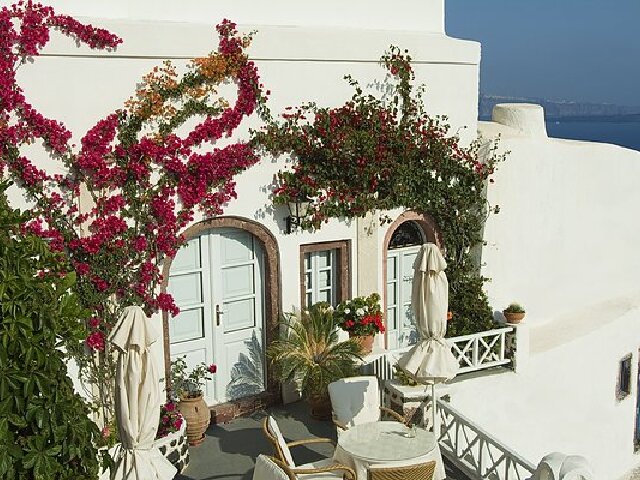 费拉小镇修建在半圆形的圣托里尼岛西部边缘400米高的火山边缘,景色相当壮观,小镇房屋的墙全是白色,屋顶是深蓝色,与天空、海洋混成一体,随手一拍就是一张明信片。早晨的闲暇时光,你可以在这里俯瞰爱琴海、眺望对面的火山岛、吹吹海风,晒晒阳光浴或在步道上随意的走走逛逛,拍拍照片。傍晚时分可以坐在靠近悬崖边的餐厅里边品尝美食边欣赏日落。到了晚上这里更是灯火通明,你可以去酒吧听听歌,点上一杯酒放松一下。