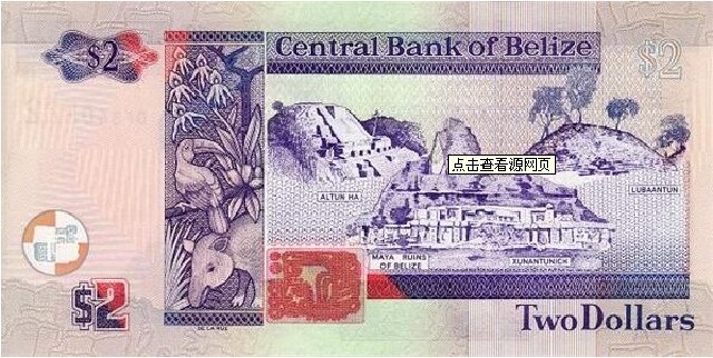 伯利兹原为玛雅人居住地,后沦为殖民地。独立后,发行了伯利兹元,其与美元挂钩,随美元浮动。固定汇率为1美元兑2伯利兹元。伯利兹元正面图案:左为古玛雅人的石雕,左下为国徽,中为鱼类,右为英国女王伊丽莎白肖像及水印;英文行名、面值。背面图案:左为水印、兰花、犀鸟和貘,右为“伯利兹的海底世界”玛雅文化遗址;英文行名和面值。彩色荧光纤维丝和荧光印刷防伪,正面有荧光油墨印刷的犀鸟图案和面值。水印:古玛雅人的神雕像。 纸币的面值有2、5、10、20、50、100元。 硬币的面值有1、5、10、25、50分。 其中币种的兑换进位为1元=100分。