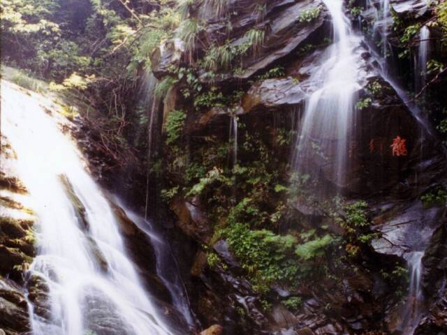 乌龙潭位于东谷山山涧中,两山夹挟一线幽涧,树木交翠,绿意盎然。潭上排列着一排高大的巨岩,彼此杂乱交叠成瀑床,泉源来自芦林之水,终年不间断流淌,水分五股轻飘而下,有如五把灿烂银梭挂在崖前。下端潭水不深,清澈见底,是观瀑的绝佳之处。潭旁石上刻着“龙泉”二字,相传用此水可铸就龙泉宝剑。传说以前潭里有条乌龙,修炼从善,每逢大旱,便为山林喷云生雾,脆降甘霖,所以多有山民前来拜祭。