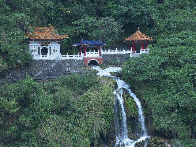 长春祠位于台湾花莲县太鲁阁公园峡谷入口附近,供奉着中横公路道路施工过程中,不幸殉职的两百多位员工的灵位,以此来哀悼这些英雄们。我们在公园内游赏险峻胜景时,也不能忘了向这些开辟山道的工作者致上崇高的敬意。唐式风格的长春祠立于断崖下,设计精巧而庄严,旁边的山壁不断涌出清凉的泉水,仿佛是一道飞瀑倾泻而下,当地人称之为“长春飞瀑”。立雾溪流经祠堂,在此听涛声也是一大景致,一幅山水庭园的画卷呈现在眼前。