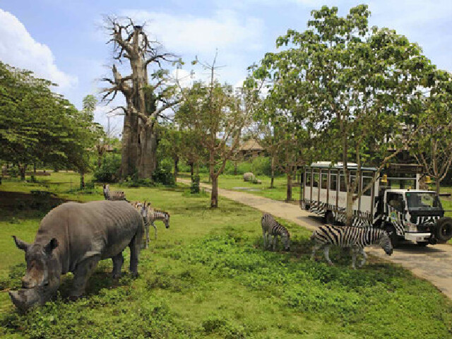 巴厘岛的野生动物园约有150种动物,占地40公顷,采用开放式豢养,其游客若要参观,方式就是乘坐观光车。观光车采用安全措施,车上有当地导游讲解,车窗可拉下,因此你可以给斑马之类温顺的动物喂食,但如果是狮子白虎就要当心了。或许是见惯了太多的人缘故,想猩猩之类的灵长类动物,甚至知道看见观光车就做各种表演和姿势让游客拍照,当然,拍完照后,它们会非常自觉地讨要东西吃。