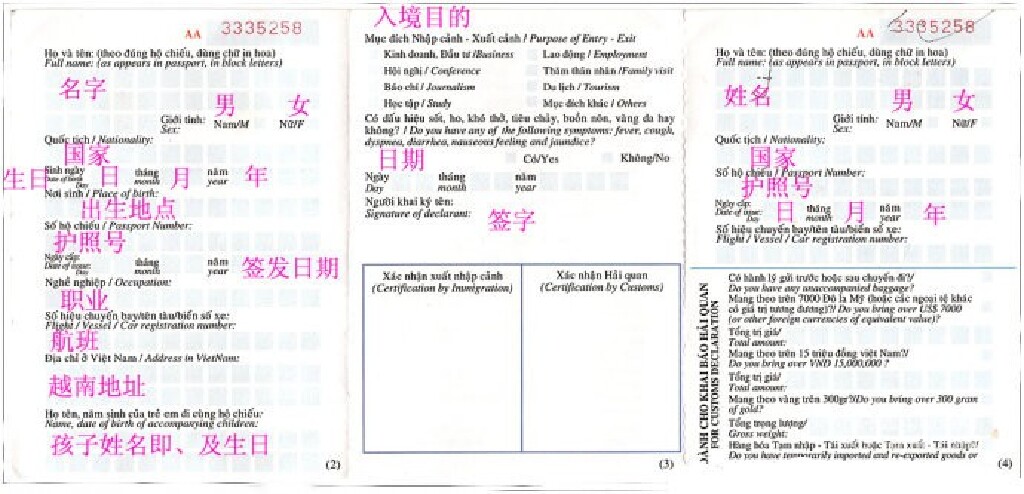 中国公民入境越南时,需要在入境口岸填写一式两联的入出境申报单(英越文),其内容包括入境、海关、动植物检疫等内容,第一联(白色)由越南边境口岸存留,第二联(黄色)入境者保存,以备出境时检查。
