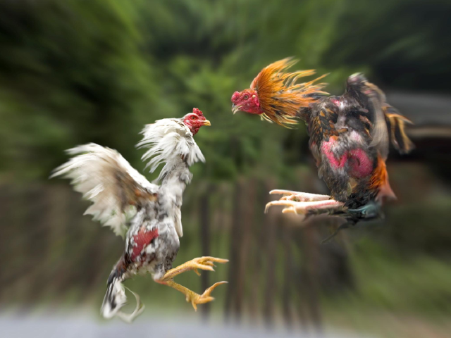 顾盼如电,抖翅生风,两鸡相搏,如武林高手对垒,战法斗技,灵活多变,腾闪击打,嘴腿并用,重爪烈翅,针锋相对。这小生灵对胜利的执著尤胜于人,往往不畏强敌,至死不休。虽为鸡,实则高傲如鹤,威猛似鹰,所以爱斗鸡者敬如国士,不惜千金以求一搏。