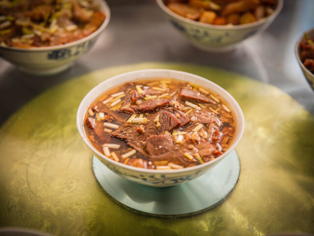牛肉片是选用优质的黄牛肉,精选里脊的部分顺着肉的纹理切片,用独创调料炖煮而成的,汤精肉烂,色鲜气香,口味纯正。咬一口满满的汤汁溢出来,满口留香,肉片非常软烂,大概因为选用的都是牛身上很嫩的部分吧,即使牙口不好的老人吃起来也不会有嚼不动的感觉。而牛肉,寓意着家族富裕,生活富足。