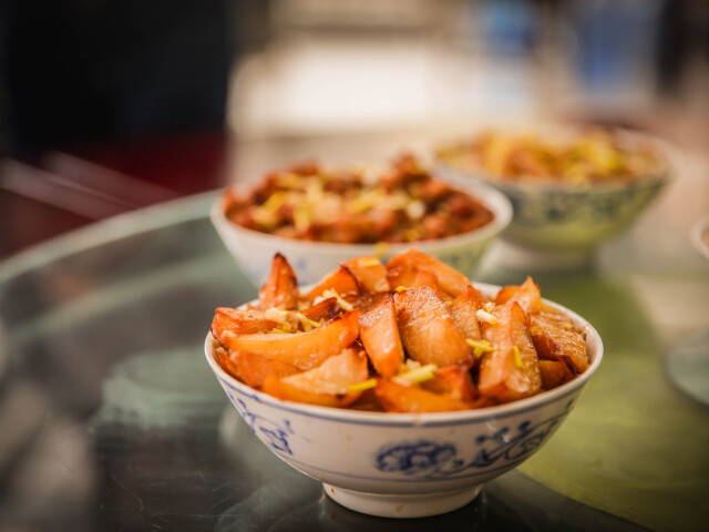 这里的土豆也是微微过油炸过的,与西方的炸薯条有异曲同工之妙,却因蒸制而成,蒸汽把独创的汤汁浸入到土豆的每一个毛孔里,我们吃起来,真是又软又面又入味。而土豆也象征着生活无忧,梦想成真。