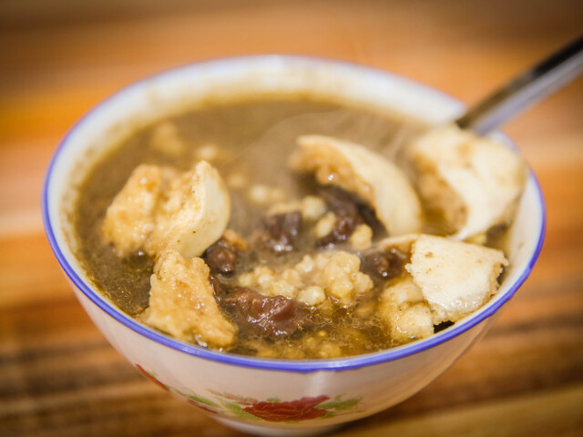馓粥,其实是以牛肉卤入汤,配上一勺麦仁,一勺牛肉,满满的一碗,馒头泡浸在汤里,特别好吃。食用馓时,首先要先盛麦仁,再盛汤,然后浇上牛肉卤,这样一碗香气喷喷的具有民族风味的小吃馓就出炉了。