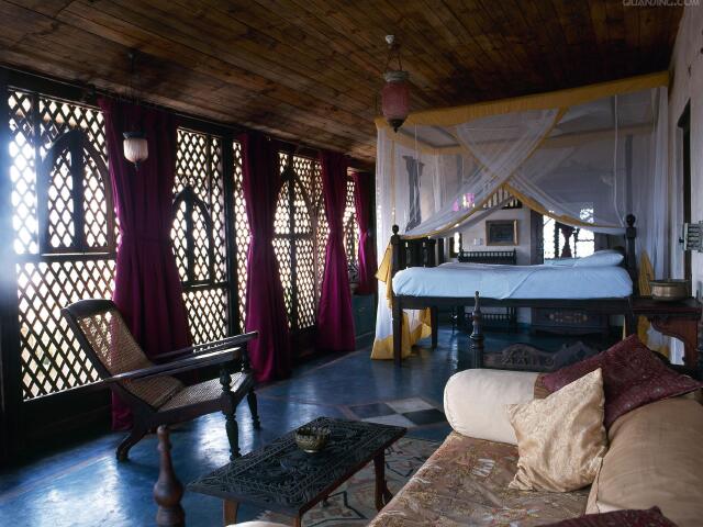 利用先在胡桃木上挖出凹槽,然后镶嵌贝壳的传统手工艺方法做成的八角木几,上面摆放的托盘、玻璃杯和台灯,都是典型的摩洛哥风格。这一切与果敢而华丽的艺品搭配,营造出艳丽夺目的感觉。有着条纹图案的金色靠垫,是用绸缎面料做成的。