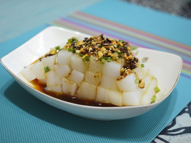 用凉水把玉米面稀释后,放入锅里煮沸腾,再用漏粉瓢漏入凉水中,经过多次换水,使之变凉,再放上咸汤(如:香椿汤、韭菜汤、黄瓜汤等)、蒜蓉、熏醋,食后十分凉爽,是夏季消暑降温的积佳食品!