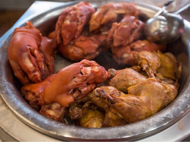 猪蹄又叫猪脚、猪手。分前后两种,前蹄肉多骨少,呈直形,后蹄肉少量稍多 ,呈弯形。中医认为猪蹄性平,味甘咸,是一种类似熊掌的美味菜肴及治病“良药”。六味斋酱肘子营养丰富,色香味俱全,酥烂香醇,色浓味厚,是六味斋的主打美食,十分值得一尝。