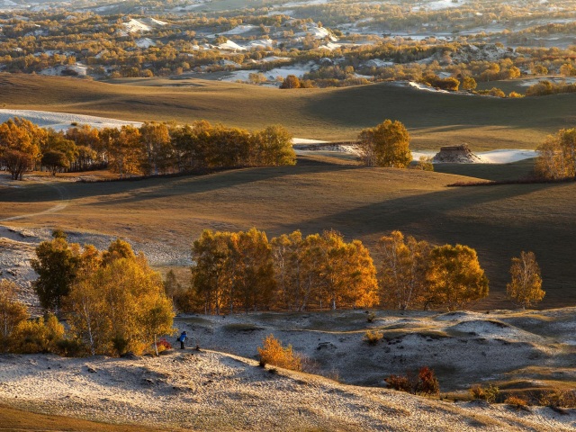 蛤蟆坝位于河北与内蒙古交界的克旗乌兰布统境内,是一块高起的平缓坡地,三边是“沟”或低地。这里地貌独特,秋天景色绚丽多彩,漫山遍野的红叶,流金溢丹,簇簇红叶中,明黄的白桦叶融合在一起,汇成一幅幅浑然天成的图画。山坡下,沟膛里,依山就势,散落着几十间茅屋草舍和新盖的红砖瓦房。鸡鸣犬吠,炊烟袅袅,很有一种古朴原始的田园风味。在摄影人眼中,这是一个百拍不厌、常拍常新的摄影创作“宝地”。