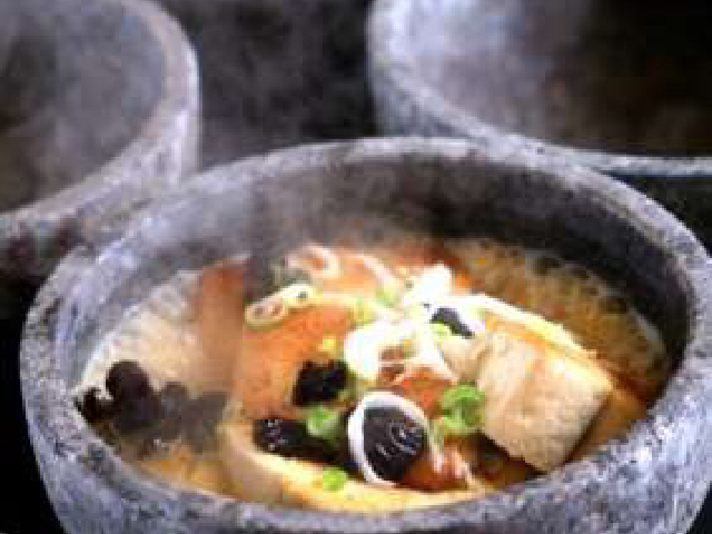 采用石磨卤水豆腐,口感较粗但是营养十足和香味馥郁,先煎金黄,之后将豆腐倒入盛满汤汁的石锅,直至汤汁沸腾。将豆腐的天然的香味充分提炼,汤汁的鲜美也逐渐被豆腐所吸收,口感Q弹。