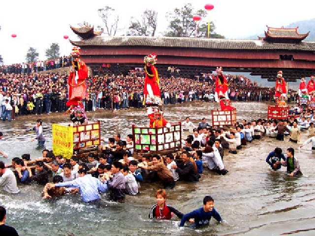 每年的正月十五,福建龙岩连城县罗坊镇在数以万计的乡民和游客簇拥下,客家民俗“走古事”开始。7棚“古事”一齐向前奔走,先在旱地里奔,随后向村头河里奔。谁先到达终点谁就赢,来年就会福气连连。是当地人每年正月十五举办的大型民俗竞技活动,被誉为“山区的狂欢节”。相传在明朝,罗坊镇常闹旱、涝两灾,当地百姓把流传北方的“走古事”移植罗坊,以祈求风调雨顺、国泰民安。