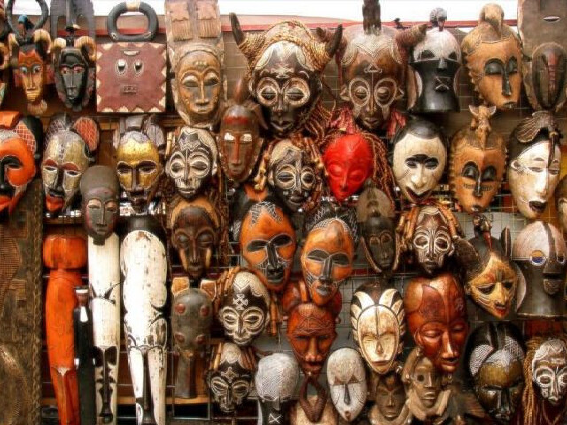 面具在非洲有着悠久的历史,在南非的史前岩画中,就发现有佩戴面具跳舞的妇女形象。不过造型丰富,艺术表现力较强的面具还是主要集中在撒哈拉沙漠以南的西非和中非地区,面具在造型上大致可分为一般面具、面具顶饰、盔形面具、肩荷式面具、装饰性面具等。非洲面具雕刻多采用软质木料,往往先刻成圆雕,再从中间剖开挖空。有的面具完成后还会用植物或矿物颜料染色。染色后的面具,不但能对人造成更大的视觉冲击,而且也有利于长期保存。