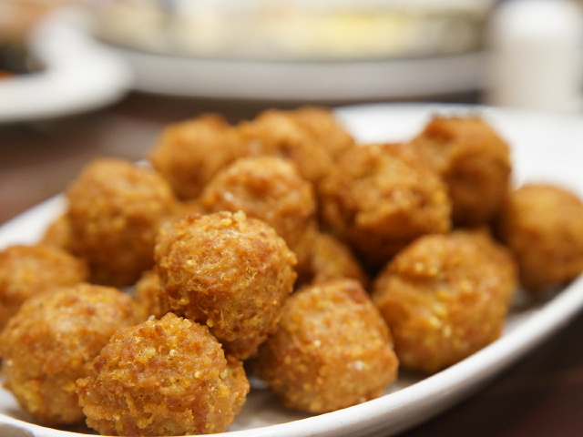 颗粒圆润的贡米,微煮后,搭配鲜嫩黑猪肉,炸出来的丸子酥脆,入口咸香,回味无穷。