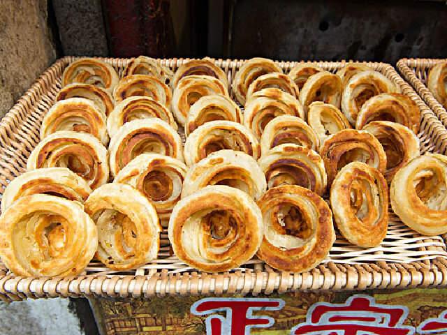 继光饼又称光饼,是福建省地福州、建瓯、顺昌等地颇受喜爱的汉族传统饼类名点之一。福州人每逢祖先祭日与每年清明节扫墓时,在众多的供品中都少不了“光饼”,它成了人们怀亲念祖的一种鲜明的地域民俗文化。以面粉为主,经发酵后,佐以精盐,制成直径约3.4厘米、厚1厘米左右、中心有一细孔的小圆体,经炭火烤熟后,饼的表面似有一层薄壳,黄中带紫,饼囊像蒸熟的馒头,疏松柔软,味道香脆略带咸味,十分可口。