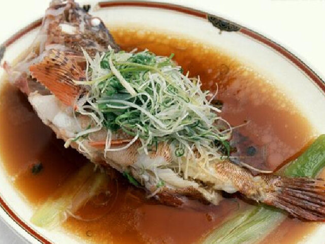 金溪石斑鱼选用生长在钱江源头溪流中的新鲜石斑鱼400克,配以紫苏、红椒、姜蒜等红烧而成。