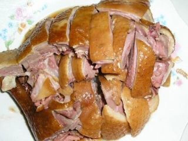 又称"无为熏鸭",是无为县传统清真名食,已有100多年历史。以巢湖麻鸭为原料,→般选用当年4斤以上的肥鸭,配以J却挂、八角、花椒、丁香、小茴香等约30种中药和调料,先熏后卤,色泽金黄油亮,皮脂厚润,肉质鲜嫩,醇香味美,回味隽永,闻名全国。