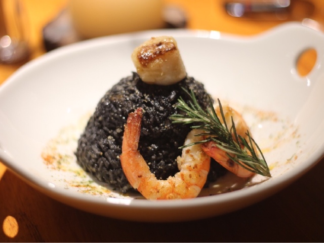 米饭加以墨鱼汁,软软的不会腥,配扇贝大虾,吃起来别有一番风味。