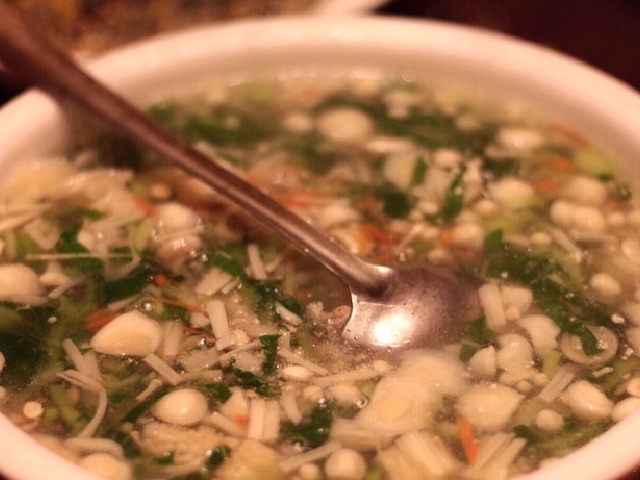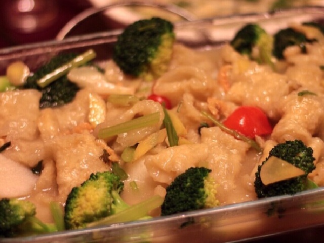 汤汁是用鸡汤打底,鱼膘口感筋道,淮山个头大,口感脆,西兰花已经变软,沾着汤汁入口,非常美味