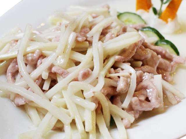 冬笋咸肉丝就是用上等的冬笋切成丝,用开水稍许煮烫一会儿即捞上来,以去掉涩味,然后与咸肉丝合炒,可让我们食欲大增。当然龙虎山的小竹笋炒雪菜肉末也是一道极受欢迎的佳味。