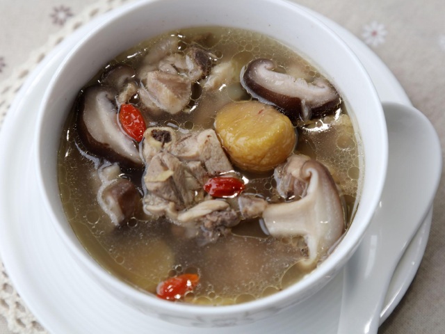 龙虎山的香菇产于深山老林之中,是天然的绿色食品,且品种繁多,营养丰富。这种个个如三硬币一般大小带花纹的“金钱菇”尤为名贵,香气浓郁,与猪肉同煮,特别爽口。将新鲜的精肉先切成肉丁,然后与干芡粉和在一起,用鎯头将肉丁敲成肉饼,使芡粉深入肉中,用清水与香菇一起煮,只放香葱不放辣,口感非常清爽。