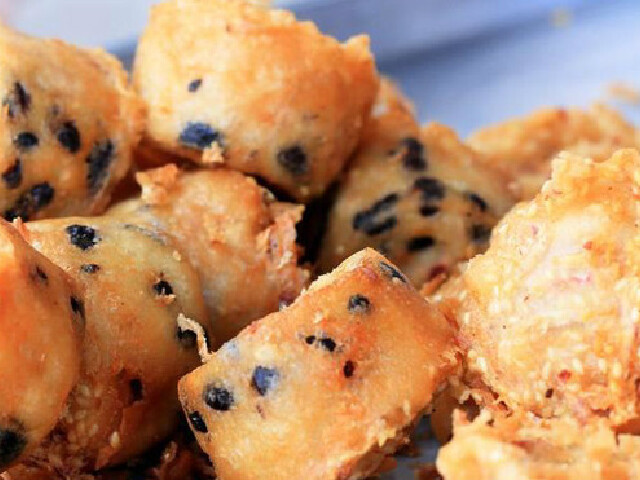 确山紫薯麻团,主要原料是确山县瓦岗紫红薯,辅料是糯米粉、芝麻、蜜红豆。麻团和我们日常吃的丸子大小差不多,里面是紫红薯泥,外面是白色糯米粉,芝麻粒均匀粘附、白里透紫、酥软可口、甜中带香,有较高的营养价值。