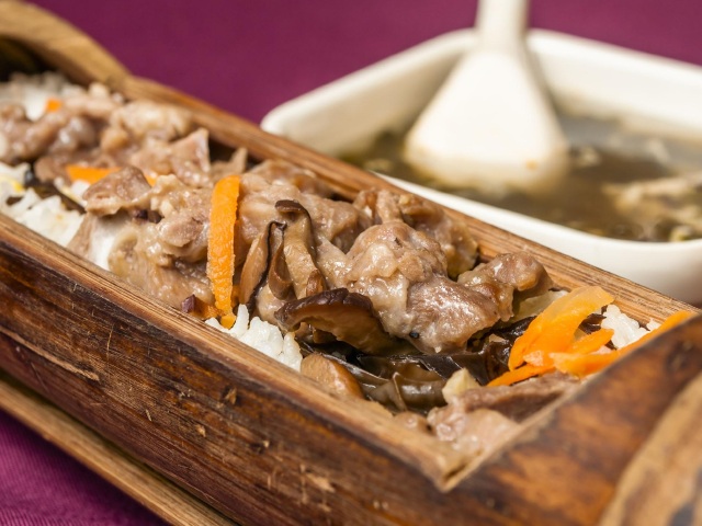 粉蒸肉是一款地道的永兴名菜,而竹筒粉蒸肉更是佳品。这款“竹筒粉蒸排骨”就是在“竹筒粉蒸肉”基础上的改良版。将嫩排骨,以新鲜的楠竹筒,锯留成节笆,通小孔,灌上菜料,再加香佐,开大火蒸,熟后有种竹香的独特。上桌时,当着食客的面剖开竹筒,以示原竹原料,原汁原色,原香原味,乡野清气伴着竹香而入口。“竹筒粉蒸排骨”是为数不多的不辣的一湘菜,糯而不腻、清新鲜香,让你从中体会到湘菜不仅仅只有辣,也有如此多情的一面。