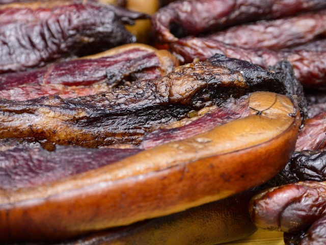 东安人有一种隔年熏腊肉的习惯。每年临近年关,杀了年猪,将猪肉切成三至五斤一块,擦上盐和各种香料后腌三至五天,待盐及香料浸进肉内,再用竹条或藤条穿串挂到火坑上,以烟火慢慢熏干,是当地有名的特产。