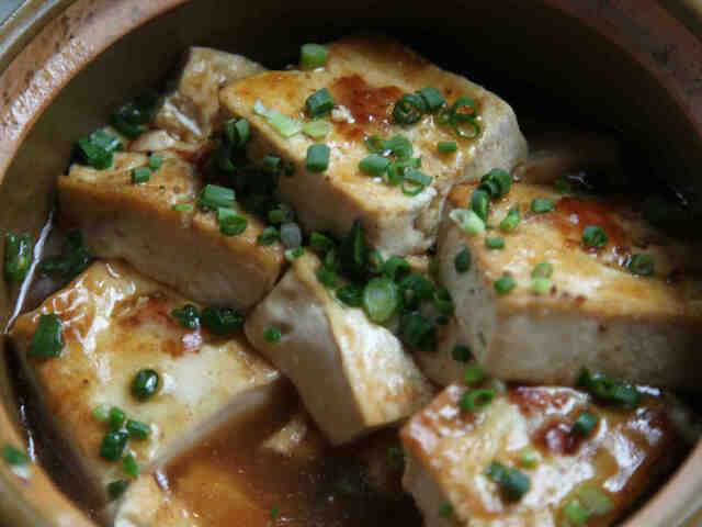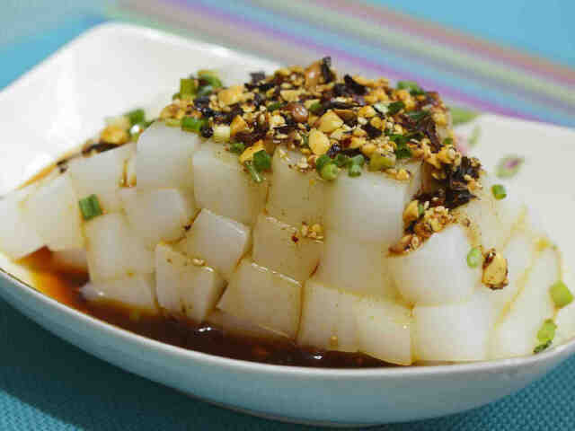 米豆腐源于湖南,是土家族、苗族地区一种传统的风味小吃。以永顺县所产的最为闻名。将米洗净,浸泡一天,和水磨成米浆。将米浆放入锅内烧热,一边加适量的食用碱(旧时用油桐果壳烧灰熬成的土碱),一边用力搅拌,直至煮熟,再放于盆内,使之冷却,即成。
