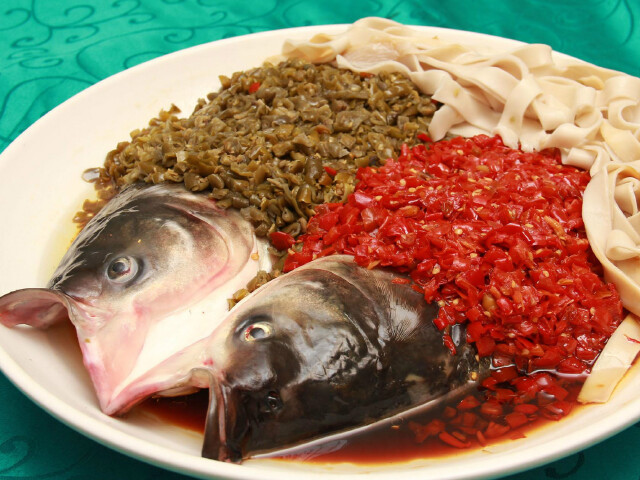 水库鱼头王是广东一带的汉族风味名菜,属于粤菜系。选用的正是水库湖深特大鳙鱼(俗称雄鱼)头。以其大且富含胶质,脑满肉肥,加上地道的剁辣椒,再配上黄辣椒、红辣椒、豆豉、秘制香油、姜片、红葱等配料,猛火蒸制约30分钟,色香味俱佳的“水库鱼头”即烹制好。