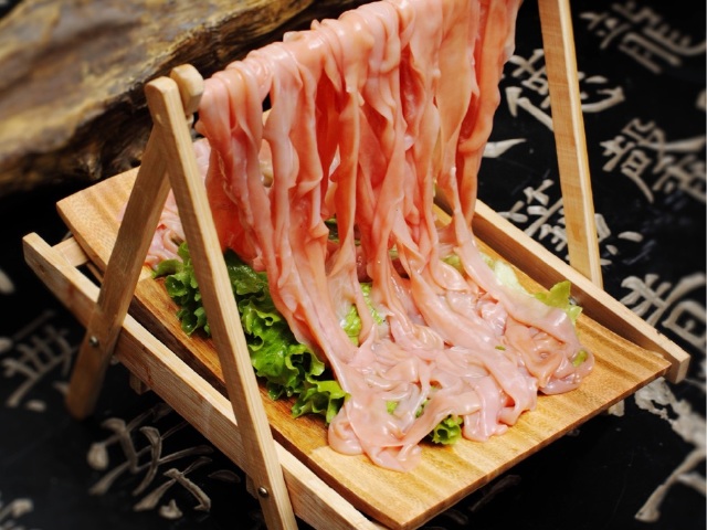 蜀味挂面鸭肠,鸭肠像挂面一样挂起来,据说只有完整新鲜的鸭肠才能做到这样。采用七上八下的技法轻轻一烫,鸭肠起卷即可,微微挂上一些油碟的味道,脆中带香,口感不错。