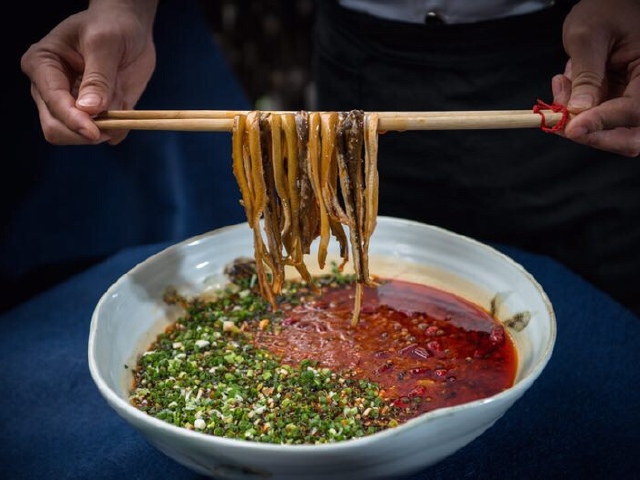 峨眉鳝丝可以说是峨眉山一带最有名的江湖菜之一。虽然此菜的做法不复杂,但是增香添鲜的调辅料却用得特别多,烹制的过程中先后用到了椿芽、藿香、香葱、酸菜等。成菜色泽红亮、香味独特,鳝丝入口柔滑细嫩。