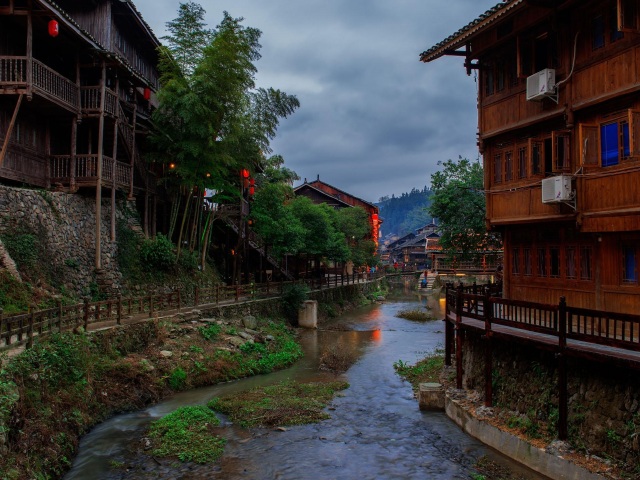 肇兴侗寨是全国最大的侗族村寨之一,有居民6000多人,被称为"侗乡第一寨"。寨中房屋全部为干栏式吊脚楼,均沿河而建,错落有致。寨内全部为陆姓侗族,建有鼓楼五座,花桥五座,戏台五座,以鼓楼分为自然片区,当地称之为"团",名称为:仁团、义团、礼团、智团、信团,各旅店地址也以团的名字为主要坐标。侗寨鼓楼是侗寨的标志,人们多在此集会、社交、休闲,五座鼓楼的外观、高低、大小都风格各异,蔚为大观。