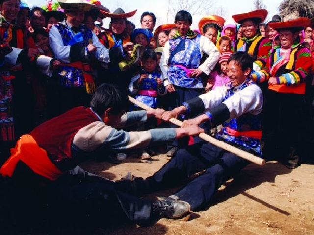 拔棍是裕固族小伙子在放牧场上的一种角力活动。夏季的牧场上牧草茂盛,羊群不会跑散,放牧的小伙子往往聚到一起,通过拔棍一决胜负。拔棍时,俩人对面伸腿坐地,双脚相蹬。拿一根结实的木棍横在中间,两双手紧握木棍,号令“开始”,俩人使劲往自己怀中拔棍,只要把对方臀部拔离地面,就算胜利。