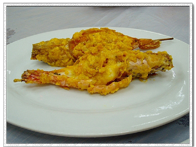 一只筷子那么大的鲜虾,外面裹着奶酪加蛋黄,壳也酥香的。大虾据说是从海边清晨刚刚打捞上来的,奶酪是国外进口的正宗品牌,鸡蛋也是沥去蛋清,只剩下淡黄,把大虾洗净去筋处理过后,裹上奶酪蛋黄糊,然后马上扔进滚烫的油锅中,并不时地用筷子翻滚大虾,出锅时虾肉色泽金黄,浓郁的香气不断地刺激你的味蕾,让你口水直流,食欲大增。