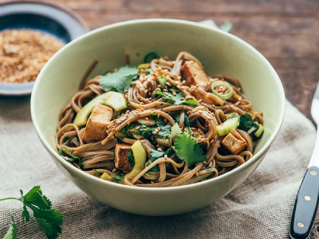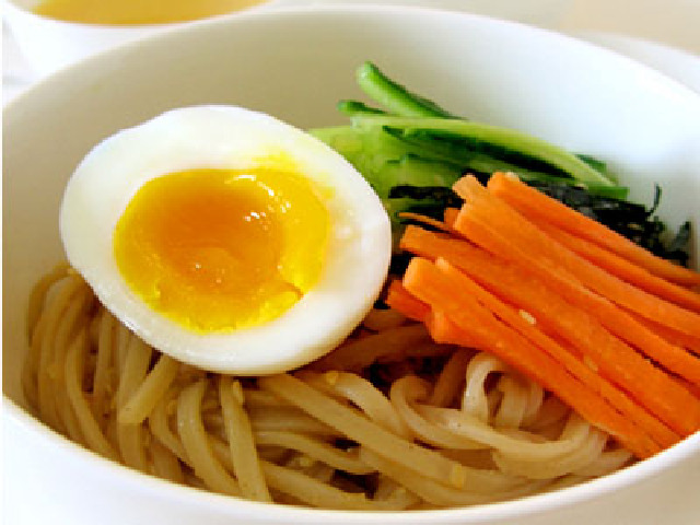 "荞麦面起源于产大量荞麦的江原道。最初用刀切成面条﹐后来转变为机械化﹐并且原来只当作夜餐吃﹐慢慢转变为白天也食用。 把荞麦面用盐水和好﹐放在压面机里压出来煮熟﹐并在面条里放蔬菜和佐料拌着吃的一种拌面。 "