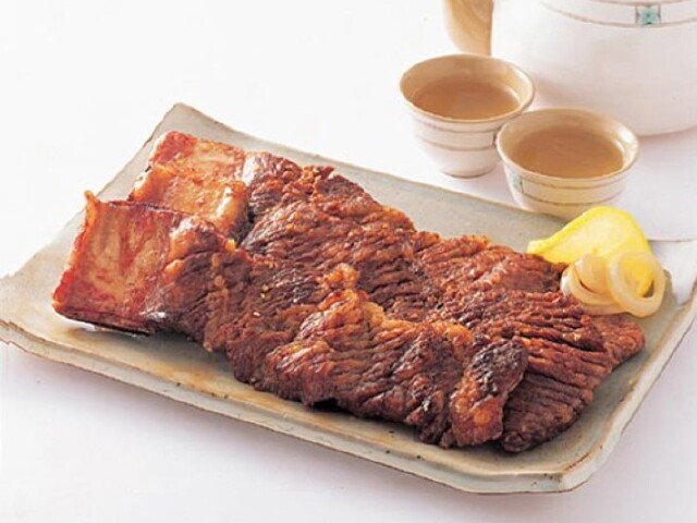 烤牛排是一道韩国传统名菜,先将带骨的牛排切成五到六厘米大小,然后抽出脂肪将黏在排骨上的肉拉平,然后将收拾好的排骨放在酱料中腌制,等酱料在排骨上抹均匀后,放在韩式烤肉专用的炭炉上烤,烤熟后拿出放在盘子上,浇上一层梨汁或者猕猴桃汁,牛肉的鲜嫩肥美,加上果汁的清甜和酱料的微辣,使得这道烤牛排吃起来非常的美味。