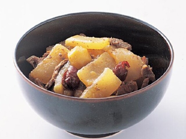 炖萝卜是一道将肉的鲜美和萝卜的清新相融合的营养美食,萝卜丰富的维生素含量众所周知,在里头还加入了红枣、银杏等佐料,其营养价值更是大增,是一道食疗佳品。做法主要是先将去皮的萝卜和切成块的猪排和牛肉、鸡肉,放在装有酱料汤水的锅里炖,期间加入银杏、红枣和香菇等佐料,就这样炖上一个小时左右,香气四溢,让人垂涎欲滴。