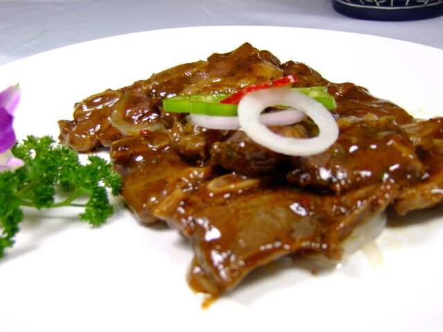 韩式金浦牛仔骨肉质鲜美,骨肉配比合理,尝起来十分鲜美多汁,口感筋道十足,香味扑鼻,是韩国料理中最重要的美食和主餐之一。它的制作过程也十分精细,将解冻的牛仔骨中加入秘制的韩国调味料,并拌匀,需要放置一至两小时后,再加菜油入锅煎炸,加汁滚煮后撒上韩国松子碎和芝麻即可。在各大餐馆里都能尝到。