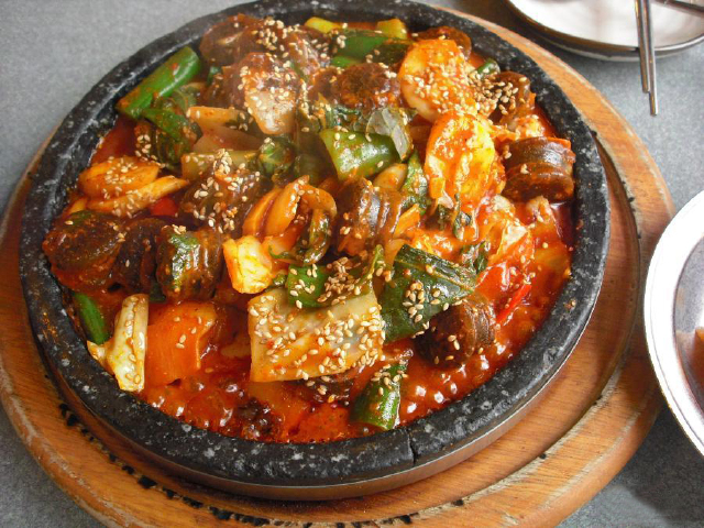 米肠是将猪血和粉丝或者黏米放在猪肠里做成的,有时还会放入萝卜、豆芽、肉丁等。炒米肠就是在铁板上,将米肠和各种蔬菜炒在一起。这是一道传统的韩国小吃。米肠还可以沾豆瓣酱吃、包芝麻叶吃、炒牛肉肠吃。米肠里富含维生素B、铁及蛋白质。这种在街头随处可见的美食,非常受学生的喜爱。